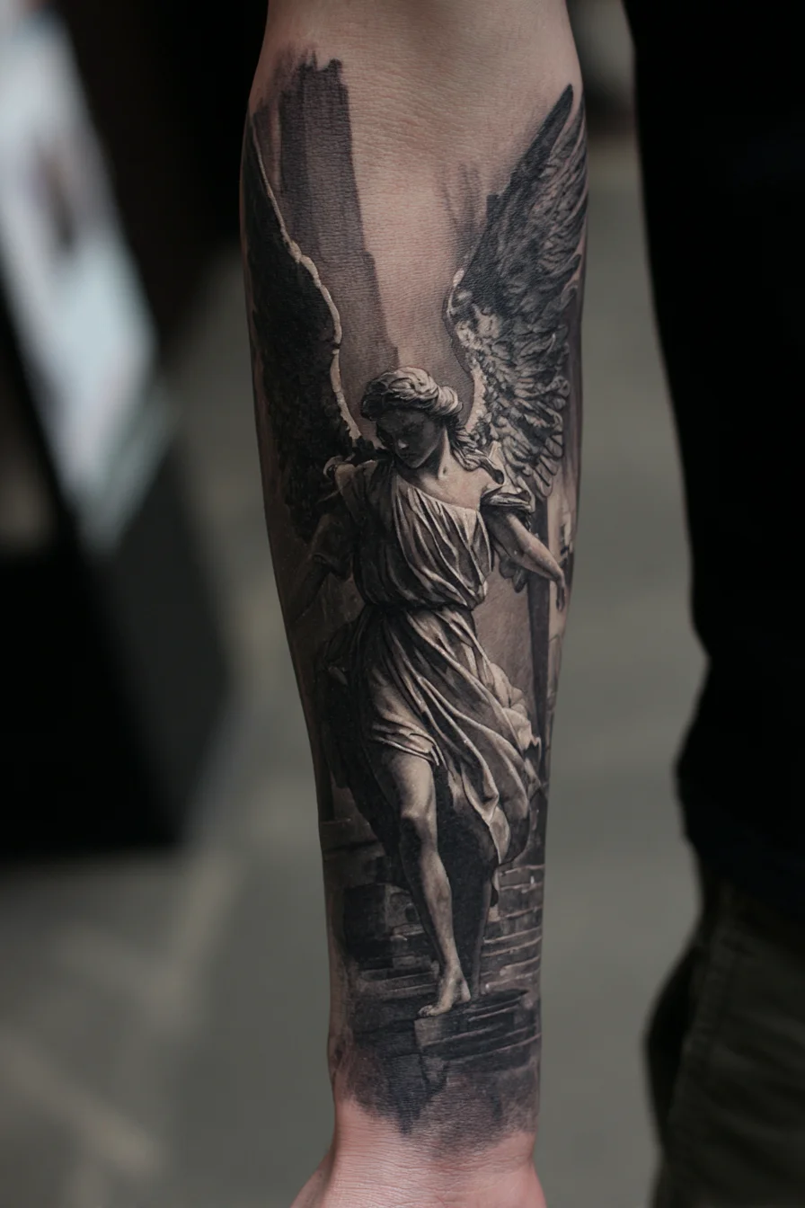 Realistic Guardian Angel Forearm Tattoo — Black & Grey Statue