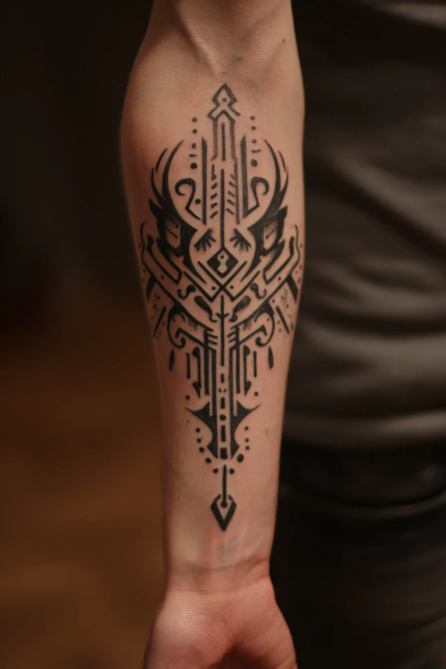 Bold Geometric Tribal Sword Forearm Tattoo — Blackwork Ornament