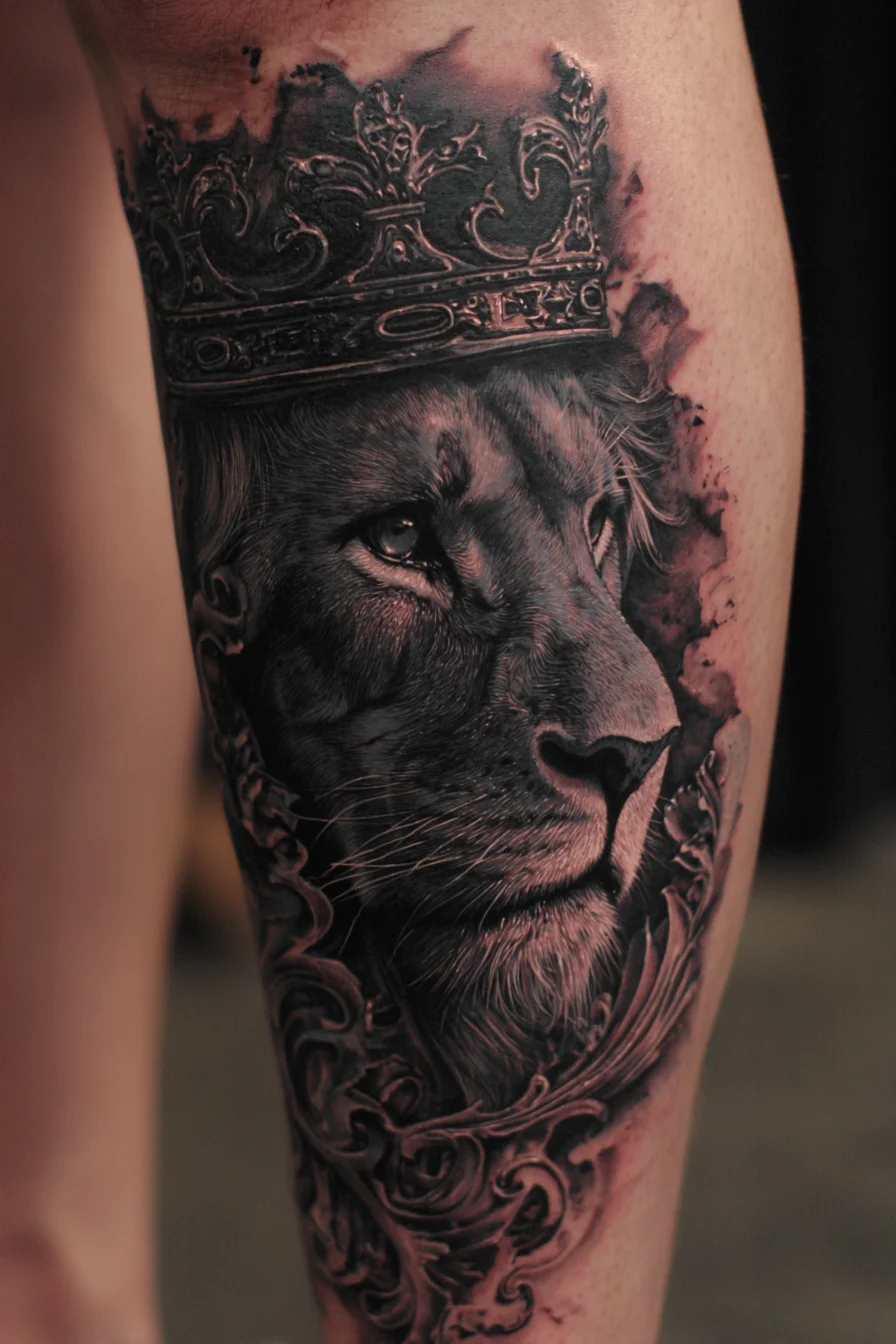 Crowned Lion Realism Tattoo — Black & Grey Calf or Forearm Piece