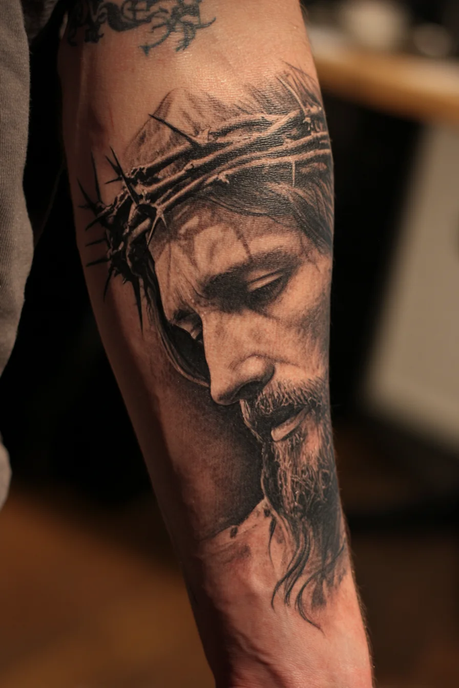 Realistic Christ Portrait with Crown of Thorns — Forearm Religious Tattoo