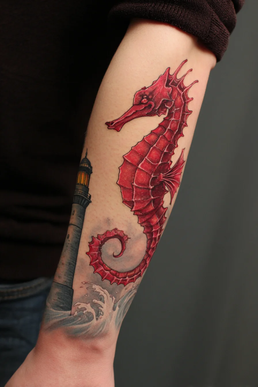 This outfit is ideal for casual weekends, creative workplaces, gallery nights or a relaxed date — any setting where you want to show personality without appearing overdone. The key is to showcase the forearm tattoo with clean, understated pieces that act as a neutral backdrop. Styling tips: choose a fitted crewneck or lightweight knit and roll the sleeves to mid-forearm so the ink is visible; avoid bulky cuffs or busy patterns that compete with the artwork. Layer with an unstructured jacket or lightweight chore coat for added dimension. Fit guidelines: shoulder seams should sit squarely at the shoulder, sleeves should be slim but comfortable through the arm, and the torso should skim without excess fabric. Pair with slim or straight-leg denim that tapers slightly to the ankle and a one–two inch break so footwear reads clean. Color coordination: stick to neutrals (charcoal, navy, olive, brown) and add a single accent that echoes the tattoo’s red tone — for example a burgundy scarf or leather detail. To recreate: dark crewneck, rolled sleeves, slim dark jeans, leather belt and Chelsea boots or minimalist white sneakers, plus a simple watch and confident grooming.