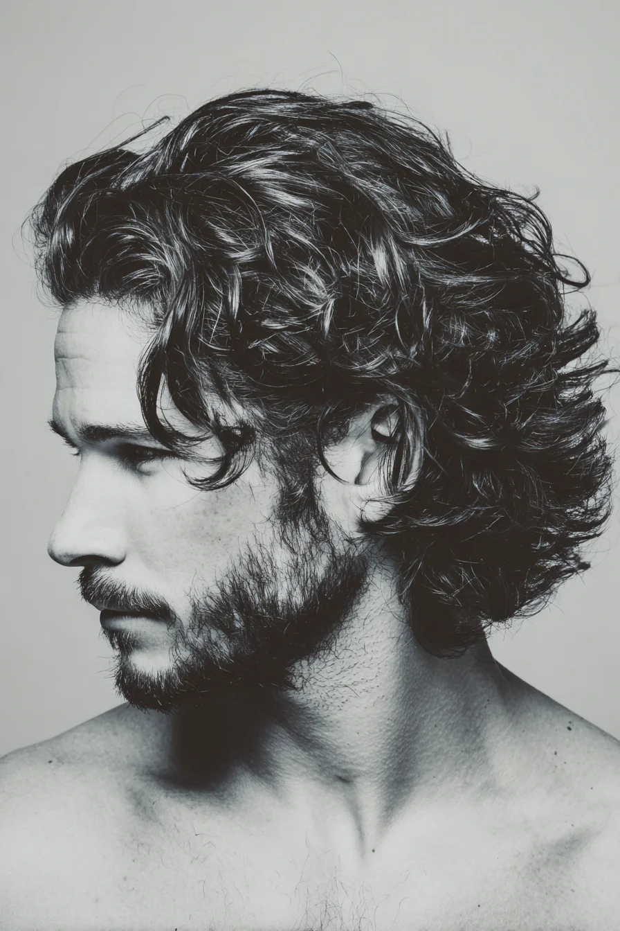 This medium-length layered cut emphasizes natural waves and a tousled, lived-in texture. It suits oval and square faces best, where the length softens strong jawlines; it also flatters heart and oblong shapes by adding balanced volume at the sides. Men with round faces can wear it if height is added at the crown to create elongation. Styling technique: start with towel‑damped hair, apply a light leave‑in or sea‑salt spray through mid-lengths and ends, then either air‑dry while scrunching or use a diffuser on low heat to enhance waves. When nearly dry, emulsify a pea-sized amount of matte paste or cream between palms and work through layers with your fingers, defining pieces and flipping the top for movement. Finish with a light texturizing spray or flexible hold hairspray. Tools needed: blow dryer with diffuser, wide-tooth comb, and fingers for shaping. Products required: sea‑salt spray, leave‑in conditioner or curl cream, matte paste/wax, optional dry shampoo. Difficulty: moderate—requires practice to control frizz and shape. Maintenance: trim every 8–12 weeks, deep-condition weekly, avoid overwashing (2–3x/week), and sleep on a silk pillowcase or use a loose top knot to preserve waves.