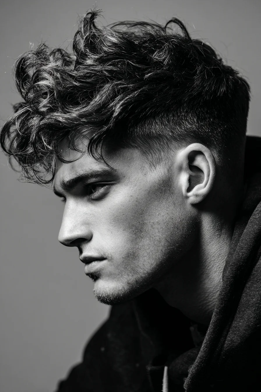 This textured curly top with high faded sides suits oval, square, and heart-shaped faces best — it adds height and softens strong jawlines. It works particularly well for naturally wavy or curly hair; very fine, straight hair can mimic the look with more product and heat styling. Technique: start with a barber-cut faded or disconnected side (clippers 0.5–2.5) and longer, layered top cut with point-cutting or texturizing shears. For daily styling, towel-dry to damp, mist a sea-salt pre-styler, then rough-dry with fingers or a diffuser to build volume. Finish by working a pea-to-nickel size of matte clay or fiber through the roots and ends to separate strands and create piecey texture; use fingers to tousle and a light-hold hairspray to lock shape. Tools needed: clippers, scissors/texturizing shears (barber), blow dryer with diffuser, comb, and fingers. Products required: sea-salt spray (pre-styler), matte clay or paste, optional texturizing powder and light hairspray. Difficulty: medium — requires a skilled barber cut and 5–10 minutes daily styling. Maintenance: trim the fade every 3–4 weeks, refresh texture with occasional deep-conditioning, and shampoo 2–3 times weekly to preserve natural texture and product buildup control.