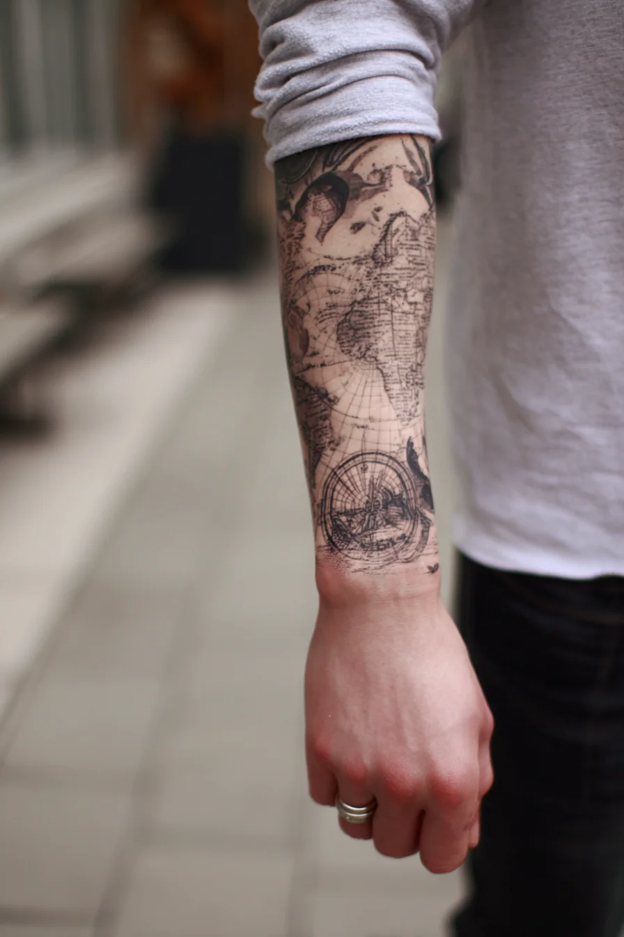 Vintage Map & Compass Forearm Tattoo — Map, Compass, Travel Sleeve