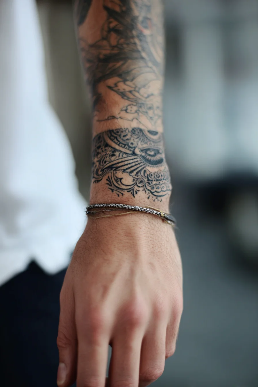 I’m Hakan — a tattoo consultant and designer with 10+ years working across studios and private clients. In this post I’ve curated 28 wrist tattoo ideas for men, with practical guidance on styles, placement, pain and long-term care. Wrist tattoos suit men who want a visible, personal statement — from subtle minimalist lines and script to bold tribal bands and micro-geometric pieces. They also work well as anchors for half-sleeves or matching couples’ tattoos. In my consultations I focus on anatomy, movement, skin tone, and lifestyle so designs age well and sit comfortably on the radial or ulnar side. Practical tips: choose scale carefully (the wrist has limited canvas), test orientation with a temporary stencil, expect sharper fading from sun and friction, plan for touch-ups, and pick an experienced artist familiar with small-detail work. Below I include 28 curated images and notes to help you choose the right wrist design.