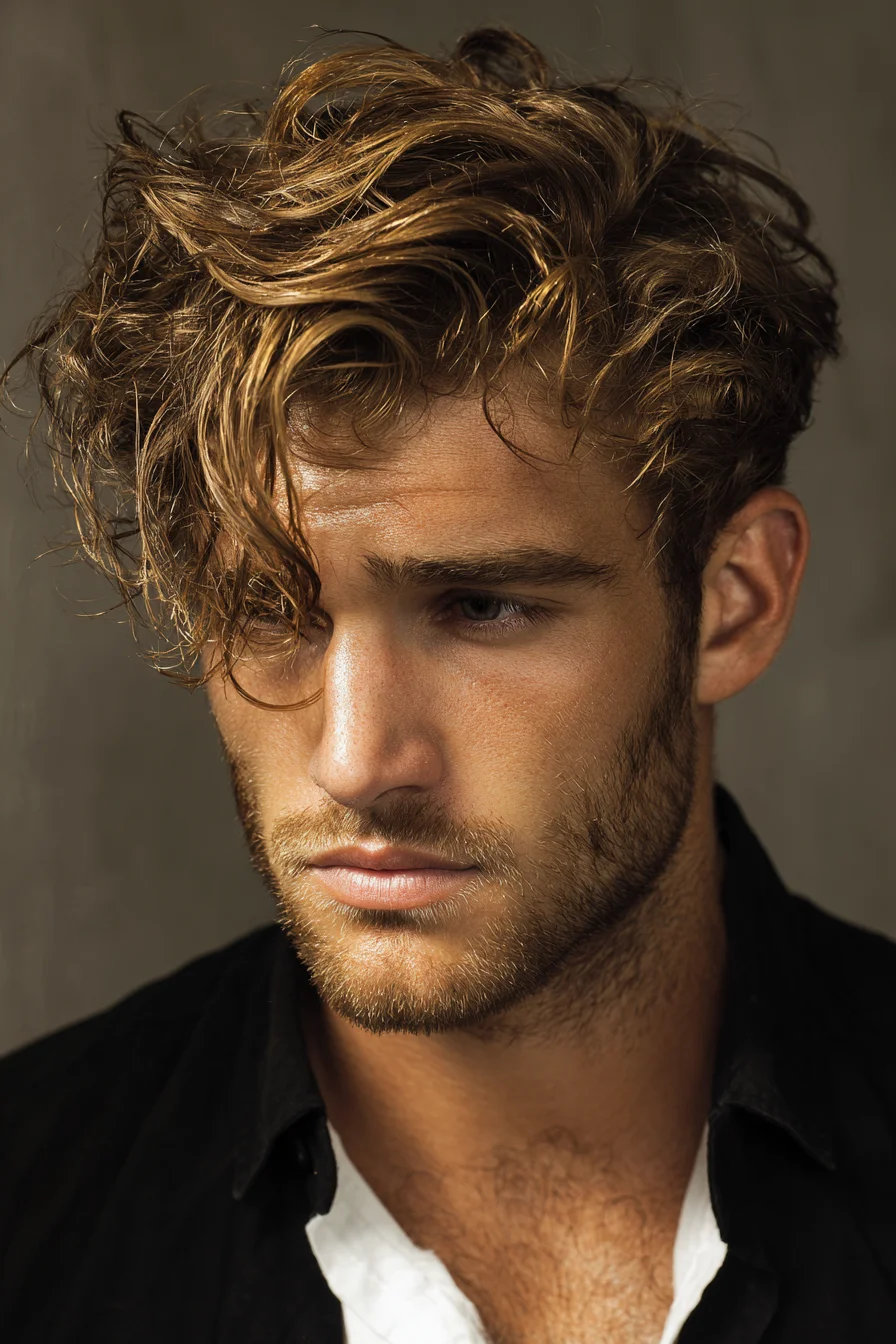 This pared-back look is ideal for weekend hangs, low-key dates, creative offices, and travel — anytime a relaxed but intentional appearance is required. Start with a well-fitting crewneck tee in a dark neutral (charcoal, black, or deep navy) made from mid-weight cotton or a cotton-modal blend for structure and comfort. Fit guidelines: shoulder seams should align with the shoulder bone, the body should be gently tapered without clinging, sleeves ending mid-bicep, and length hitting just below the beltline. Style textured hair with a light sea-salt spray or curl cream to enhance definition without stiffness; keep facial hair short and well-trimmed for a rugged-clean finish. Color coordination: pair the dark tee with slim indigo jeans or olive chinos, a tan or camel overshirt/field jacket, and white leather sneakers or brown Chelsea boots for contrast. Accessories should be minimal — a low-profile watch or leather bracelet. To recreate the look, invest in a quality crewneck, a textured-hair product, a five-minute daily beard trim, and one versatile jacket. Focus on clean lines, natural textures, and proportion to keep the outfit modern and effortless.
