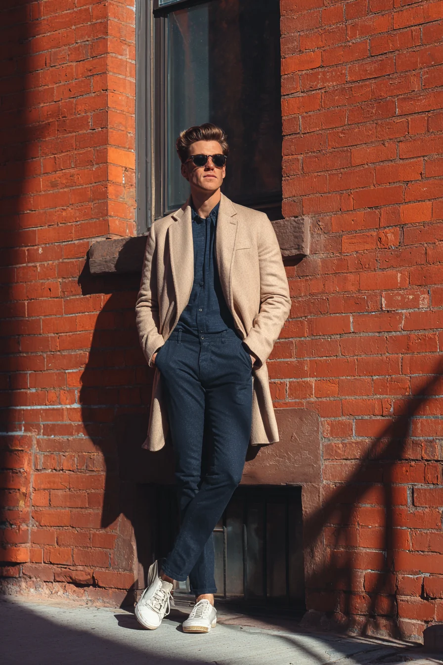 This is a modern smart-casual look that works for city weekends, casual meetings, date nights, and travel. It pairs a streamlined beige overcoat with a deep navy button-down and slim navy trousers, finished with clean white low-top sneakers and classic sunglasses. For fit, choose a single-breasted coat that sits at mid-thigh with a natural shoulder (seams on the shoulder bone) and just enough room to layer—sleeves should reveal a half-inch of shirt cuff. Opt for slim, slightly cropped trousers with a minimal break so the ankle line and sneakers remain visible. Color coordination is simple: a neutral warm coat brightens the outfit while tonal navy pieces provide depth; white sneakers add a crisp, contemporary contrast. To recreate: start with a wool or cashmere-blend camel/beige overcoat, a navy chambray or cotton-poplin shirt, navy wool or structured-cotton trousers, and white leather sneakers. Styling tips: half-tuck the shirt for relaxed polish, add a slim leather belt in brown or navy if tucking, and swap sneakers for Chelsea boots or loafers to dress it up.